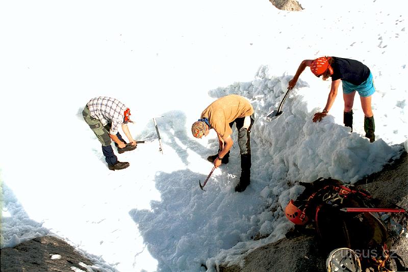 V podvečer si kopeme základy Basecampu cepínama do solidně tvrdého sněhu. A že to byla fuška, fuj!