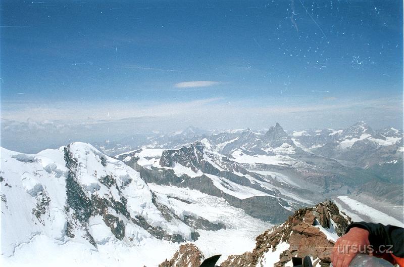 A jsme na vrcholu Monte Rosy neboli Dufour-Spitze (4634m). Pohled na Lyskamm ("Lidožrout") vlevo a Matterhorn před námi