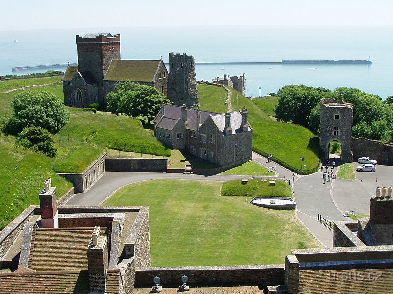pohled na nádvoří Doverského hradu a průliv La Manche v pozadí