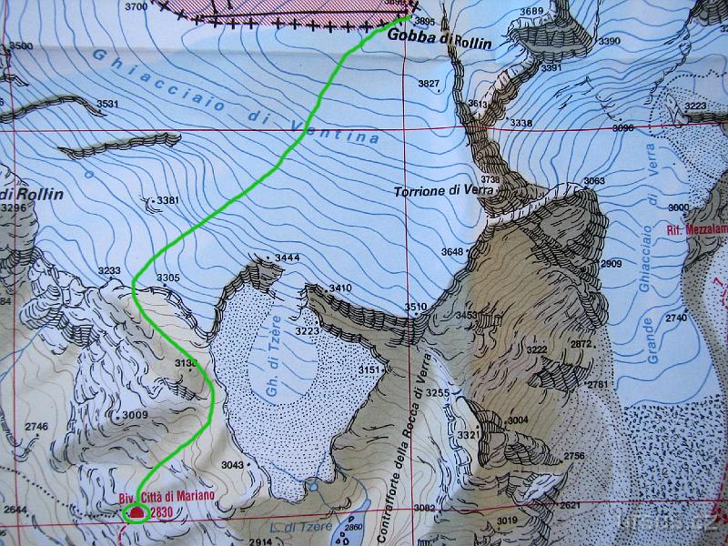 Trasa naší aklimatizační tůry z bivaku na Gobba di Rollin