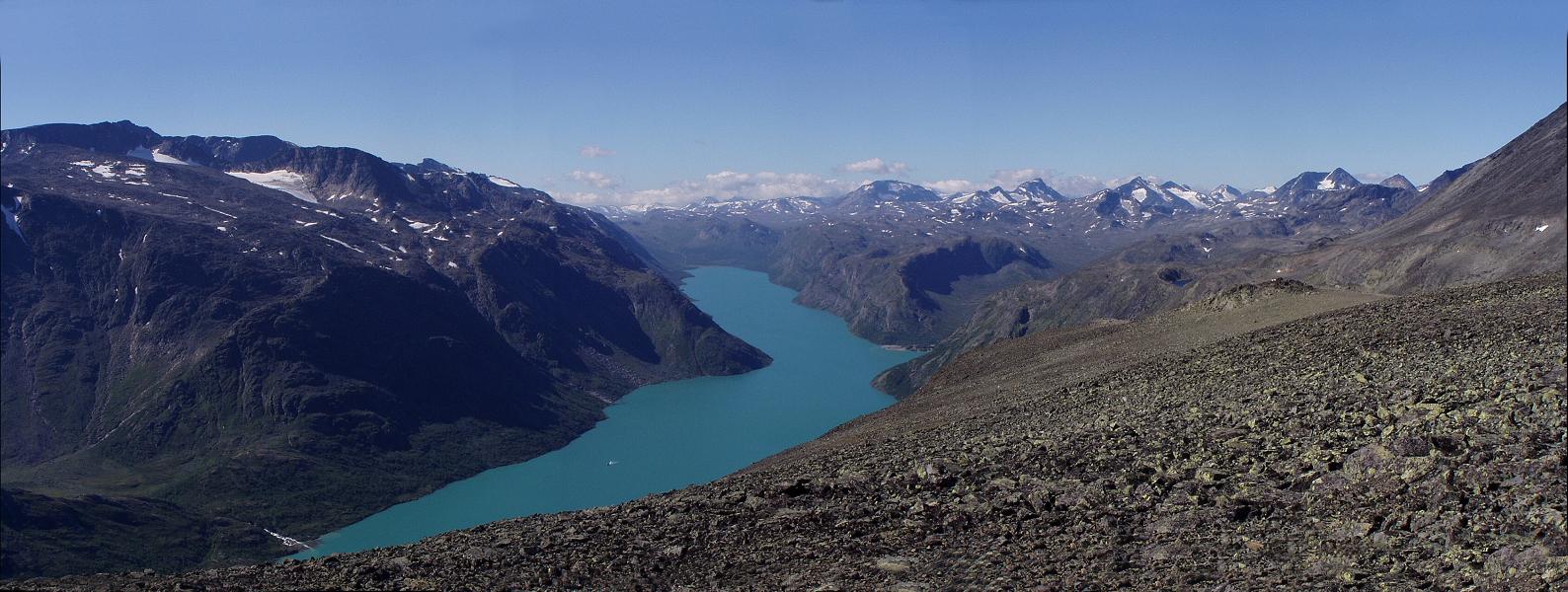 jezero Gjende z Veslfjelletu(1743m.n.m.), v pozadí vrcholky Jotunheimenu