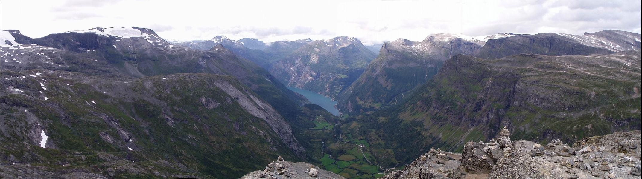 na Dalsnibbě(1634m.n.m.), hoře s výhledem na Geirangerfjord i na vrcholky ledovcem pokrytých hor