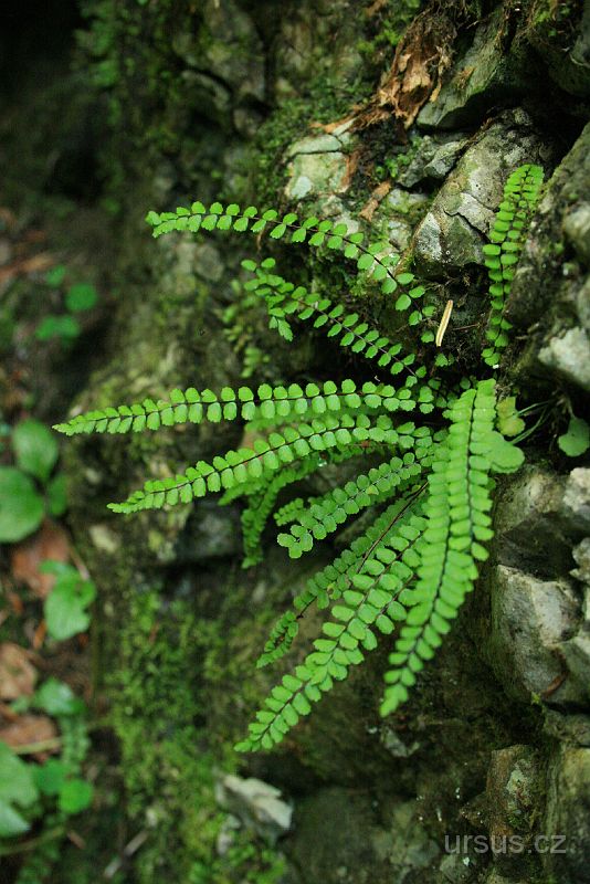 Na vlhkých skalách roste Sleziník červený (Asplenium trichomanes L.).