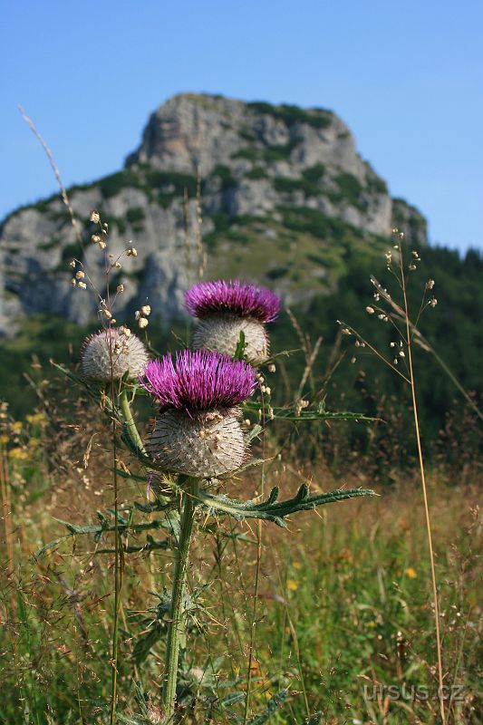 Pcháč bělohlavý ( Cirsium eriophorum) je jakýsi symbol letní fatry, v pozadí se tyčí Malý Rozsutec.