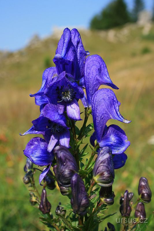 Tato květina má tvar přilby, po slovensky se jí říká prilbica tuhá a po česky oměj tuhý (Aconitum firmum).