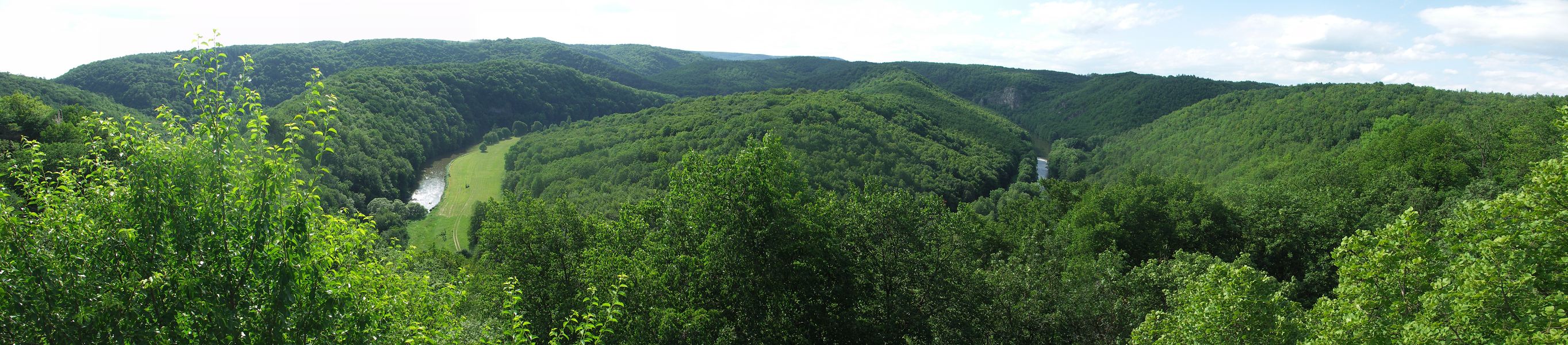 řeka Dyje se jako had klikatí ladnými meandry mezi zalesněnými ostrohy