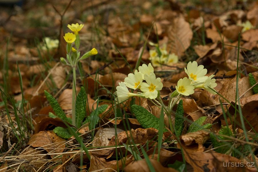 Prvosenka vyšší (Primula elatior) v popředí a prvosenka jarní (Primula veris).