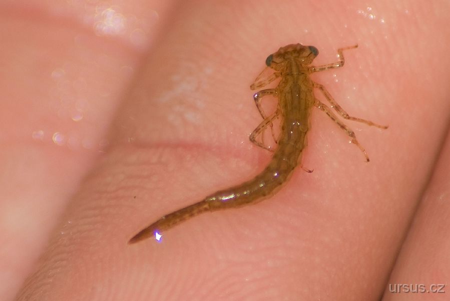 A takhle vypadá larva jepice (Ephemeroptera). Typické jsou tři štěty vyrůstající ze zadečku. Na této fotce jsou však všechny tři štěty přilepeny k sobě.