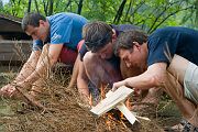 Martin, jakožto vrchní zálesák-architekt staví máju.