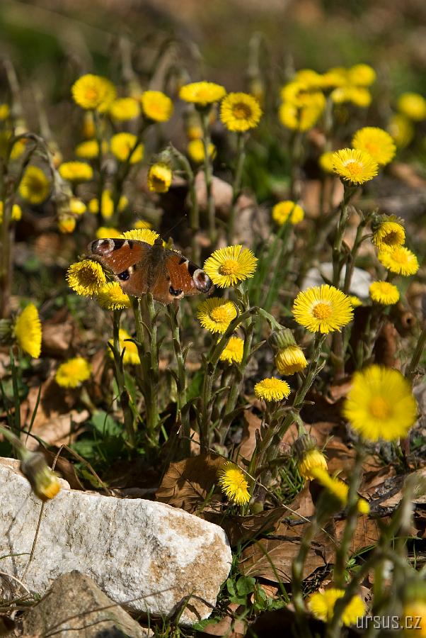 Babočka paví oko (Nymphalis io) v záplavě podbělů (Tussilago farfara)