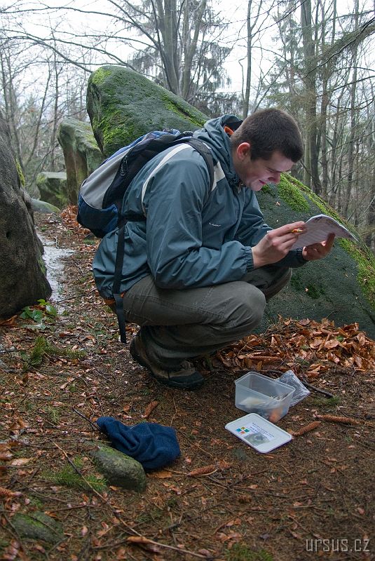 Majkl si pročítá zápisky našich kolegů geocacherů, kteří tu byli před námi.