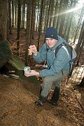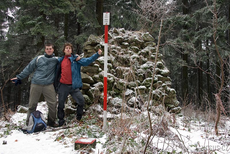 Dnešní vrchol dne- Vsacký Cáb (841m.n.m.) Spokojené výrazy nemáme jen díky tomu, že na samotném vrcholu jsme oba poprvé (nevede sem totiž značka), ale také proto, že nalézáme druhou kešku.