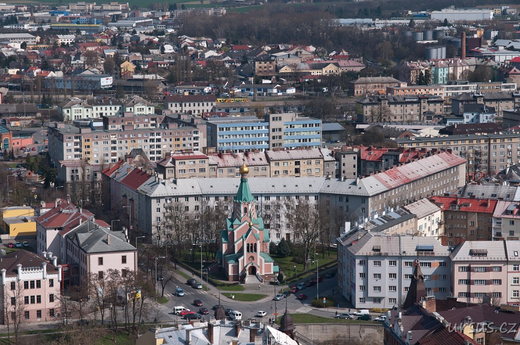 ...který ostře kontrastuje s moderní výškovou budovou Regionálního centra Olomouc.