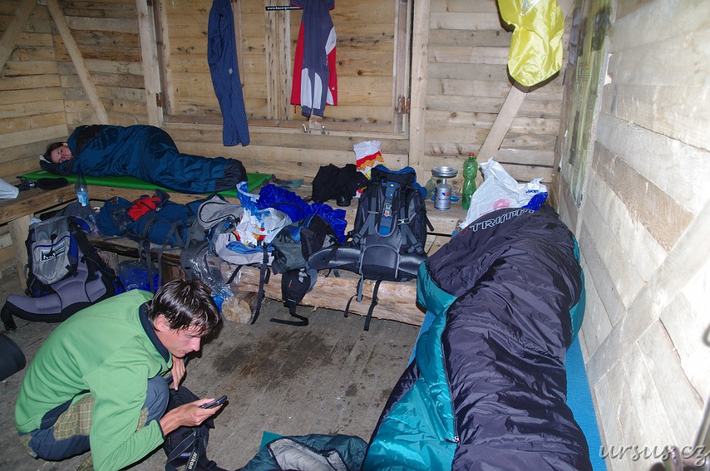 Jeli jsme nahoru klasicky nadvakrát, a ti co jeli v první várce měli opět štěstí, protože cestou nahoru viděli už podruhé za dva dny medvěda. Což byla sice supr zpráva, na druhou stranu dosti zneklidňující vzhledem k tomu že už se blížil večer, my neměli kde spát a medvědi tu očividně byli na každém kroku, což nám potvrdil i recepční v místním hotelu "Kota 1400", který doslova řekl, že medvědi tu kolem slídí skoro každý den a že spát tady venku je sebevražda...Nezbylo než na něj zatlačit a překecat ho aby nás nechal za rozumnou cenu přespat v hotelu. Na to máme naštěstí mistra Huse, vrchního ukecávače, který ve spolupráci s Aničkou vyjednal vskutnu výhodné podmínky, všechny nás narvou do jednoho dvoulůžáku a jednoho trojlůžáku. Tím pádem cena na jednoho na noc bude pěkných 180Kč (místo 500:)