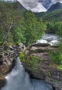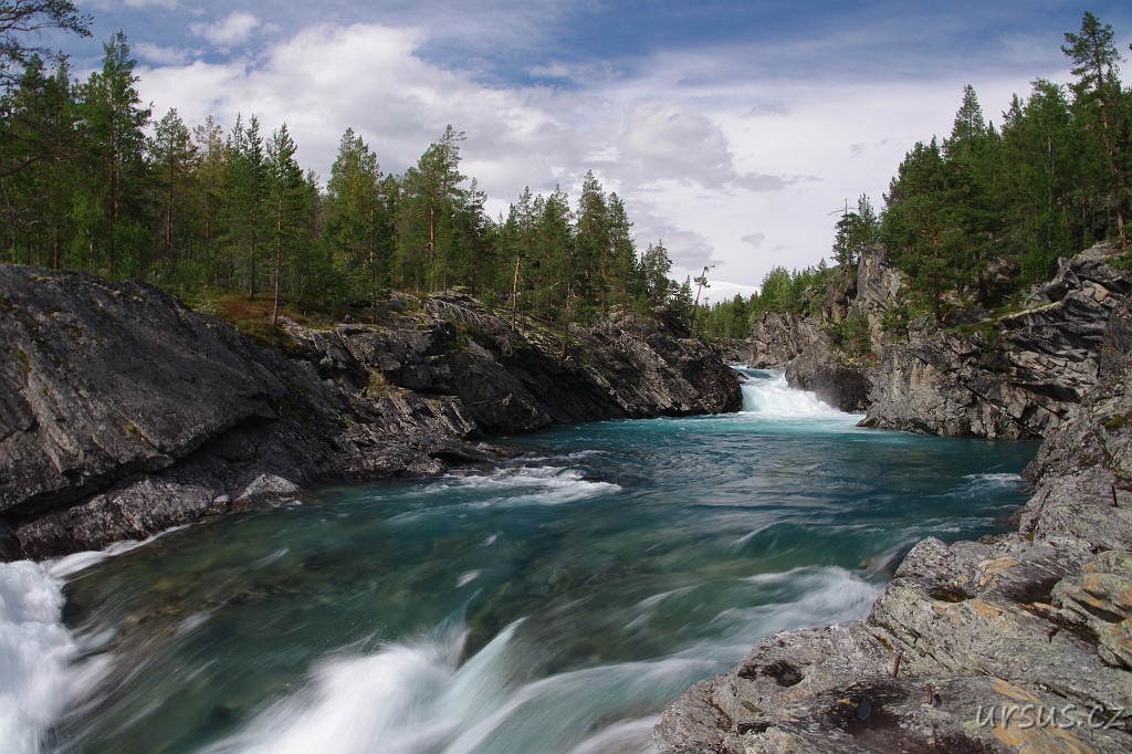 Po několika hodinách chůze po břehu jezera docházím k mohutné peřeji, kterou se do jezera Gjende valí voda z údolí Leirungsdalen. Dál již cesta podél jezera nevede.