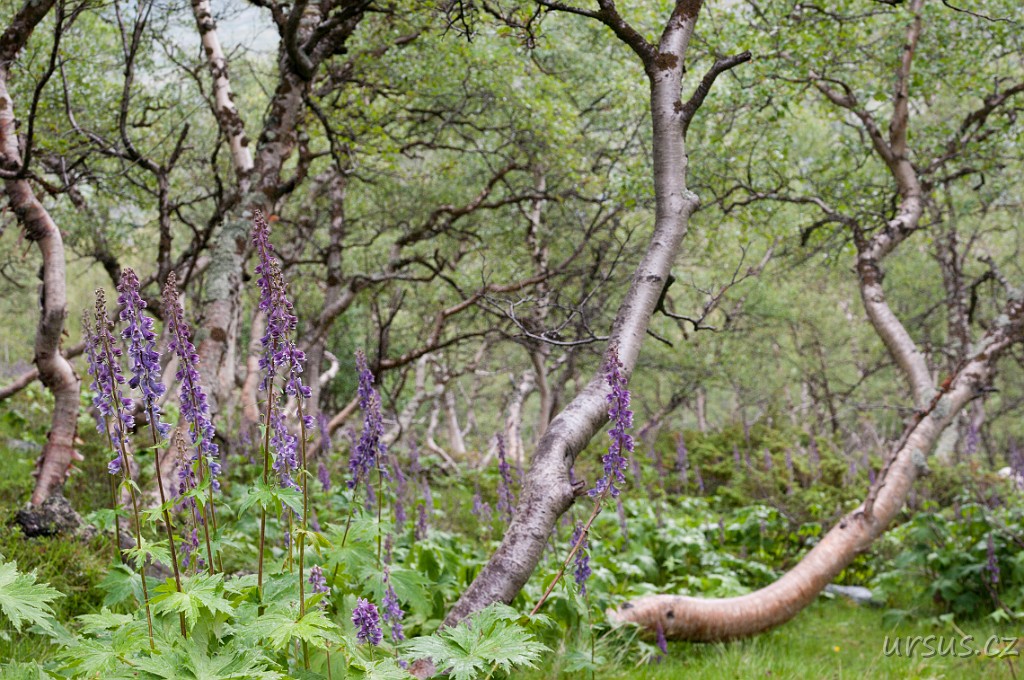 Oměj šalamounek (Aconitum plicatum) a zakrslé břízy.