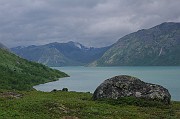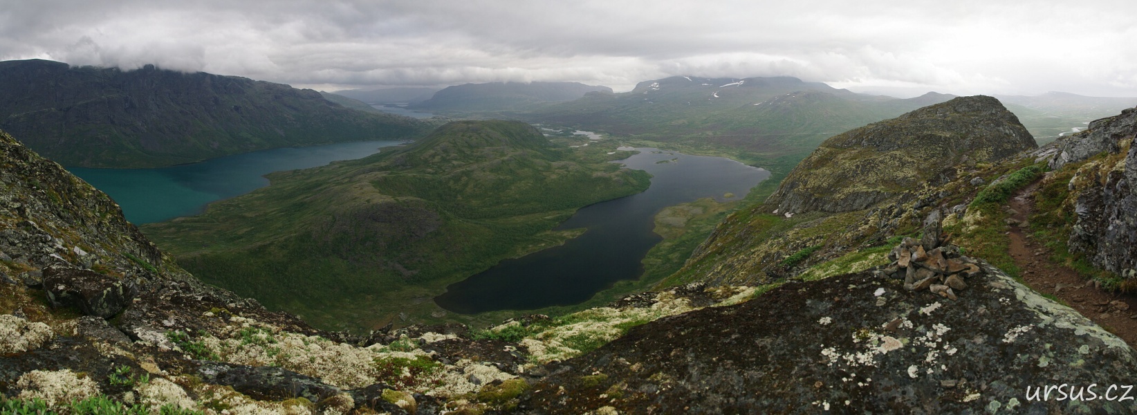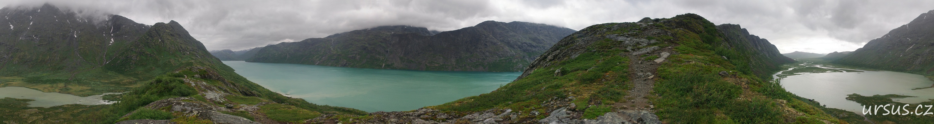 Jezero Gjende má oproti šedému Ovre Leirungen sytě zelenomodrou barvu díky ledovcovým plaveninám.