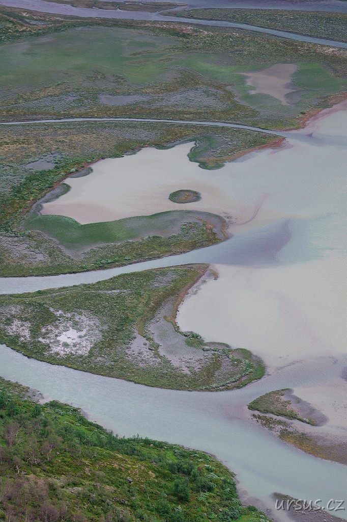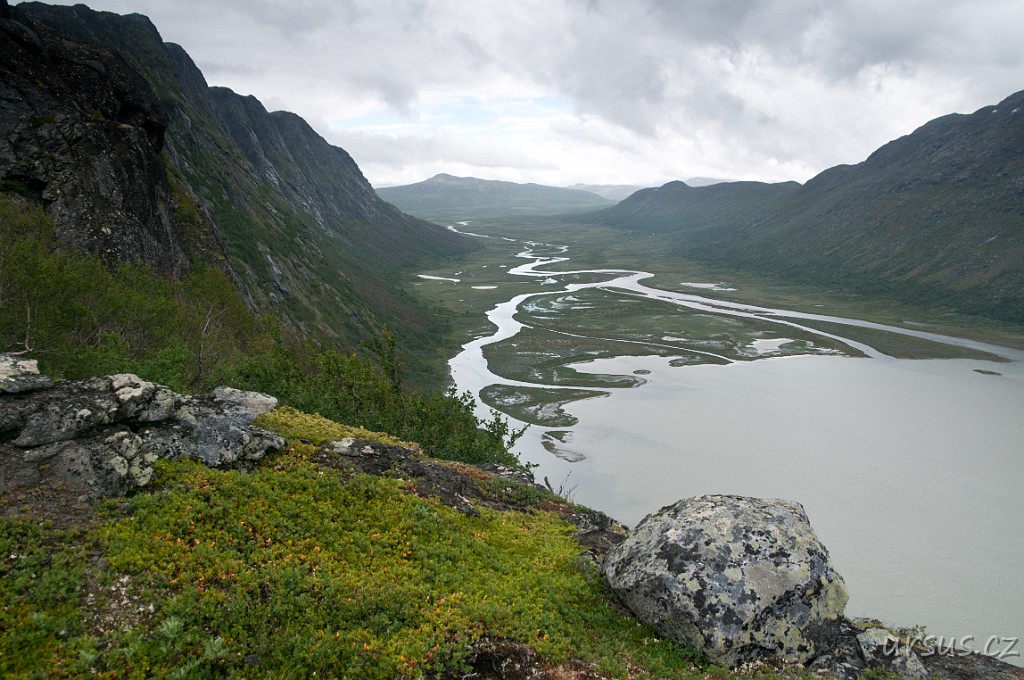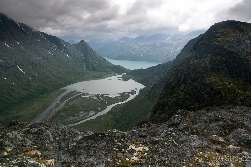 Z hřebene je krásně vidět i náš kemp a klikatící se řeka Sjoa.