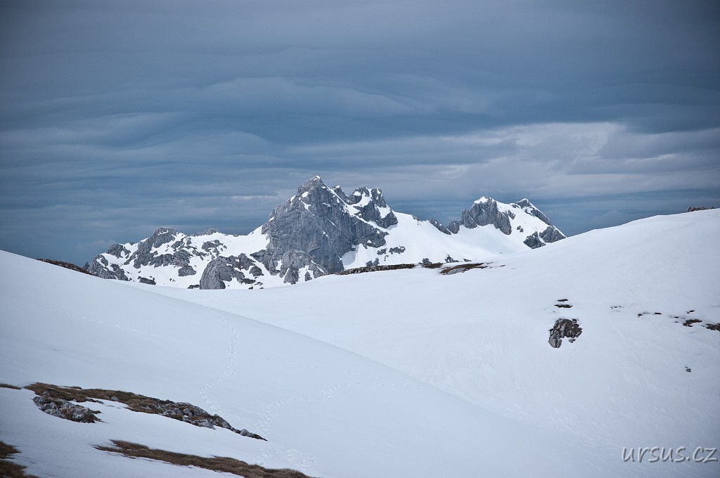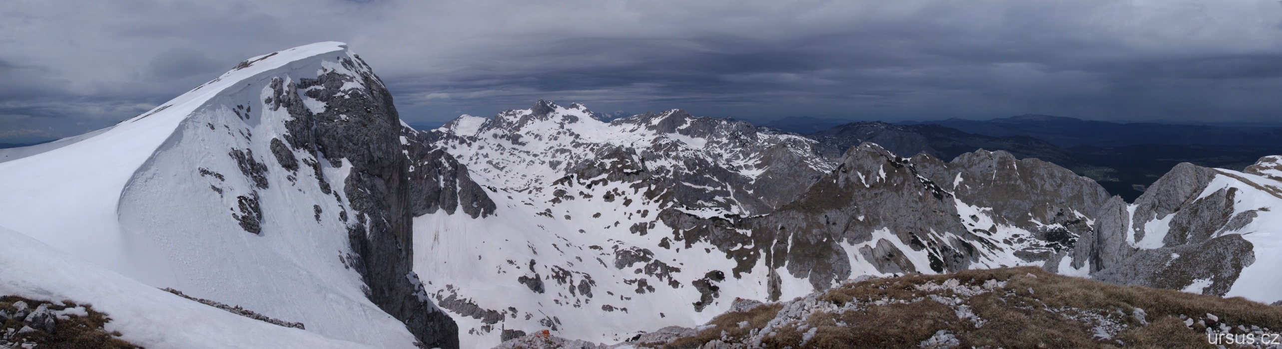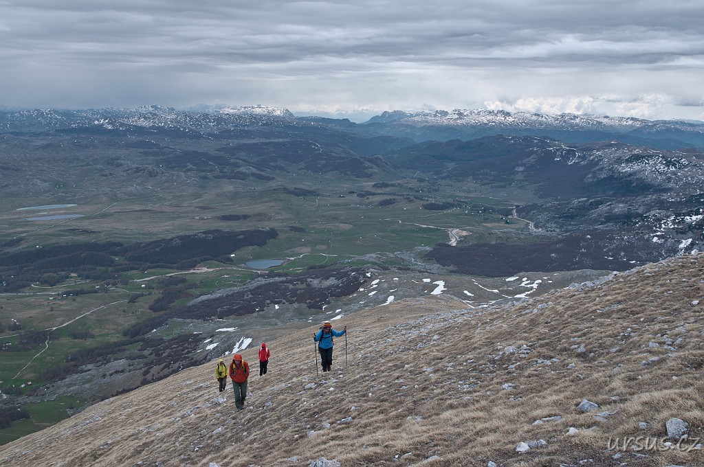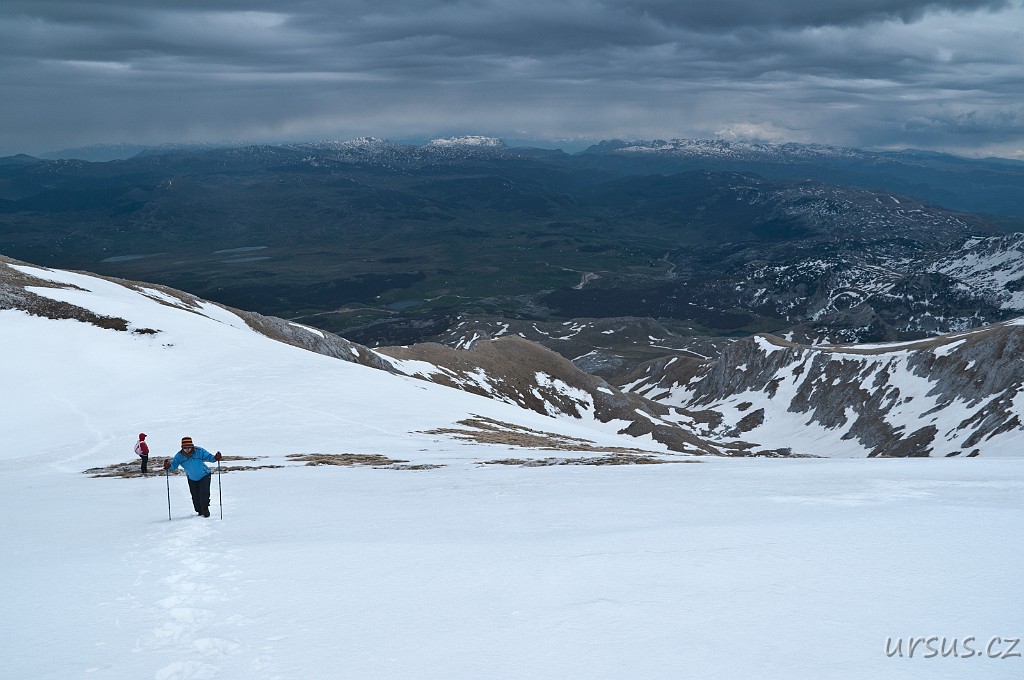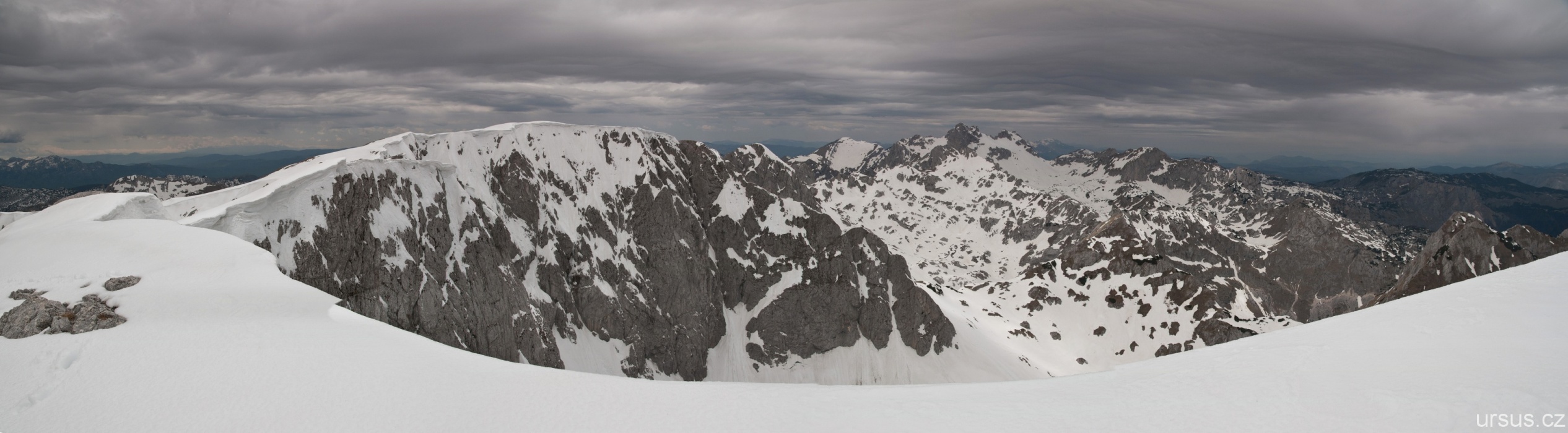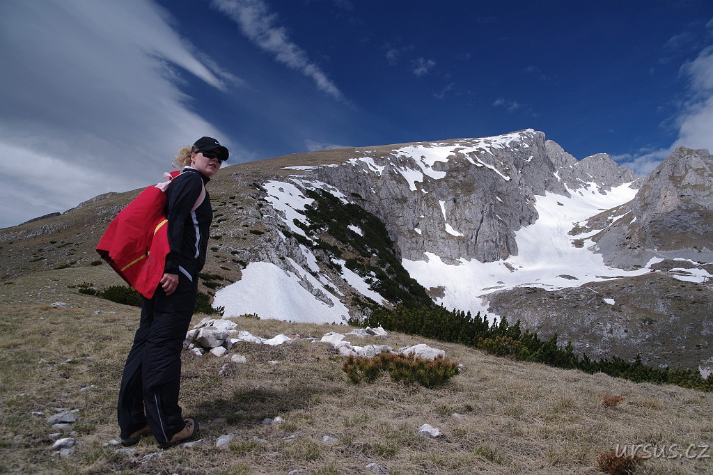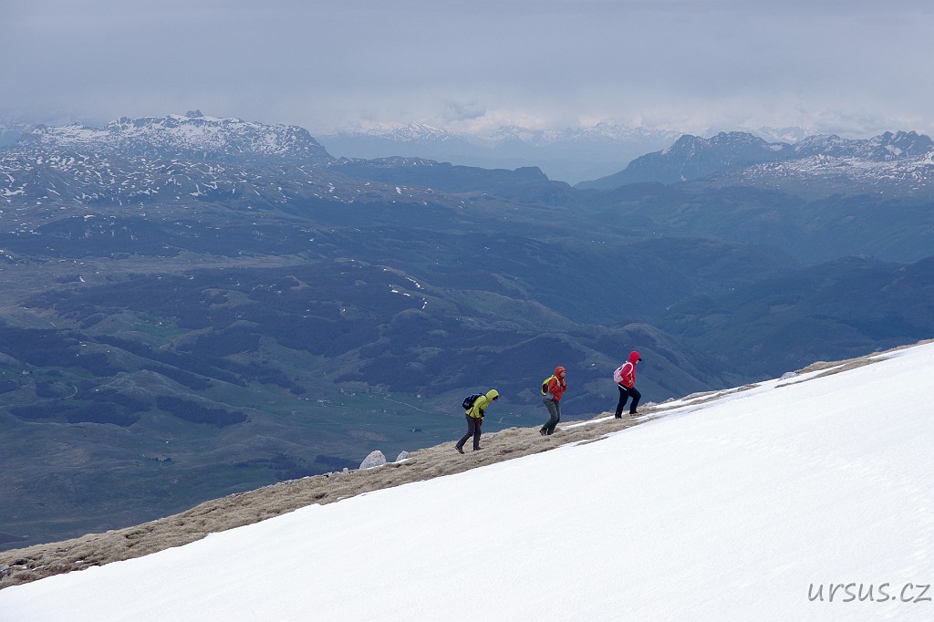 Zpoza sněhových polí vykukuje nejvyšší hora Durmitoru i celé Černé hory- Bobotov kuk (2523 m n.m.).