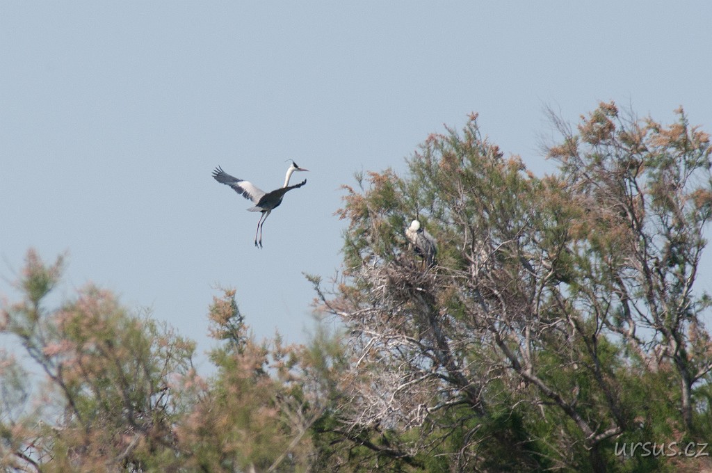 Volavka popelavá (Ardea cinerea) přistává na hnízdo.