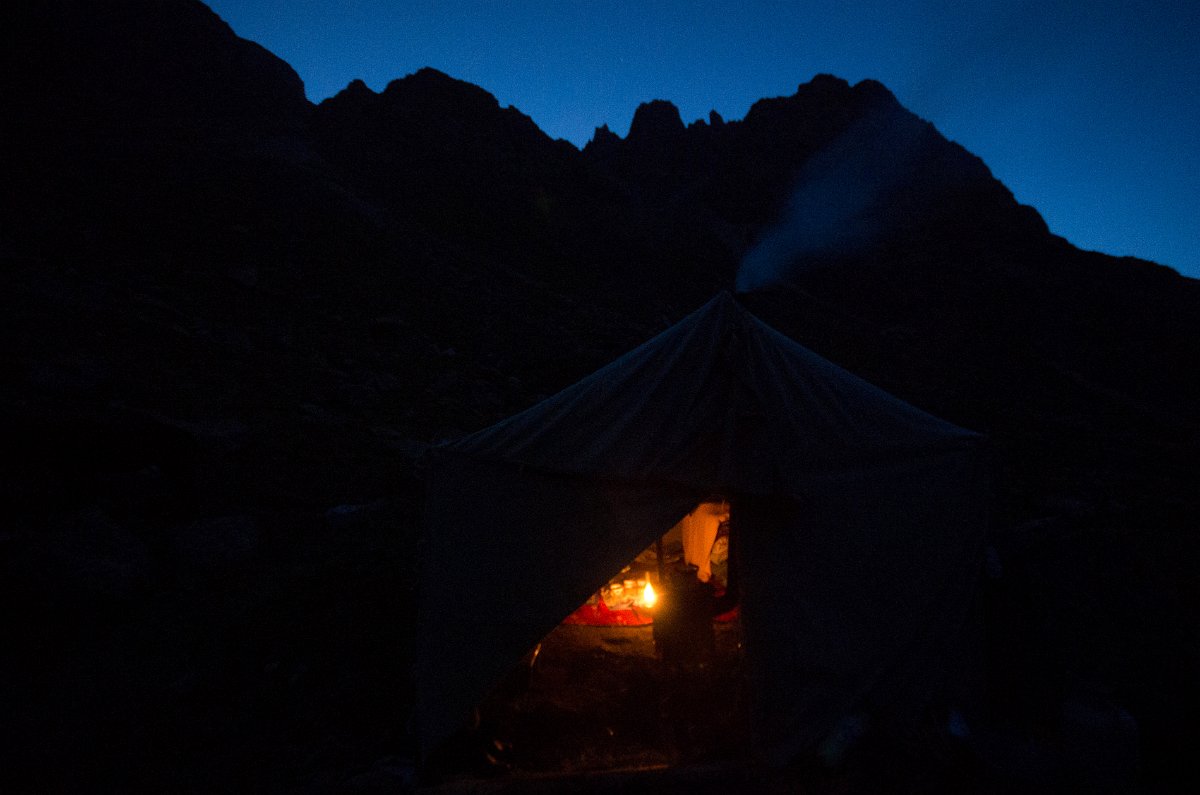 33 Jsme na vrcholu ve výšce 4146 m a tady už je vysoká nadmořská výška cítit. Do toho vane studený vítr a blíží se další přeháňka. Proto neváháme a po balvanech míříme zpět ke vzdáleným stanům. Přicházíme navečer poměrně solidně vyčerpaní, ale ještě zvládáme uvařit večeři a přestavět stan tak, aby lépe odolal silnému větru a dešti.