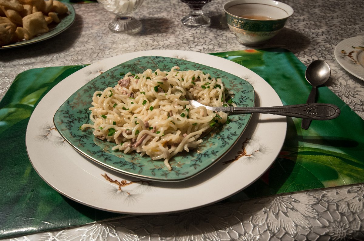 49 Dostáváme pokoj pro hosty, který je obložený perskými koberci. Navíc nám bábuška vaří tradiční večeři, která začíná sladkým předkrmem koblížků a marmelády, následuje salát...