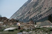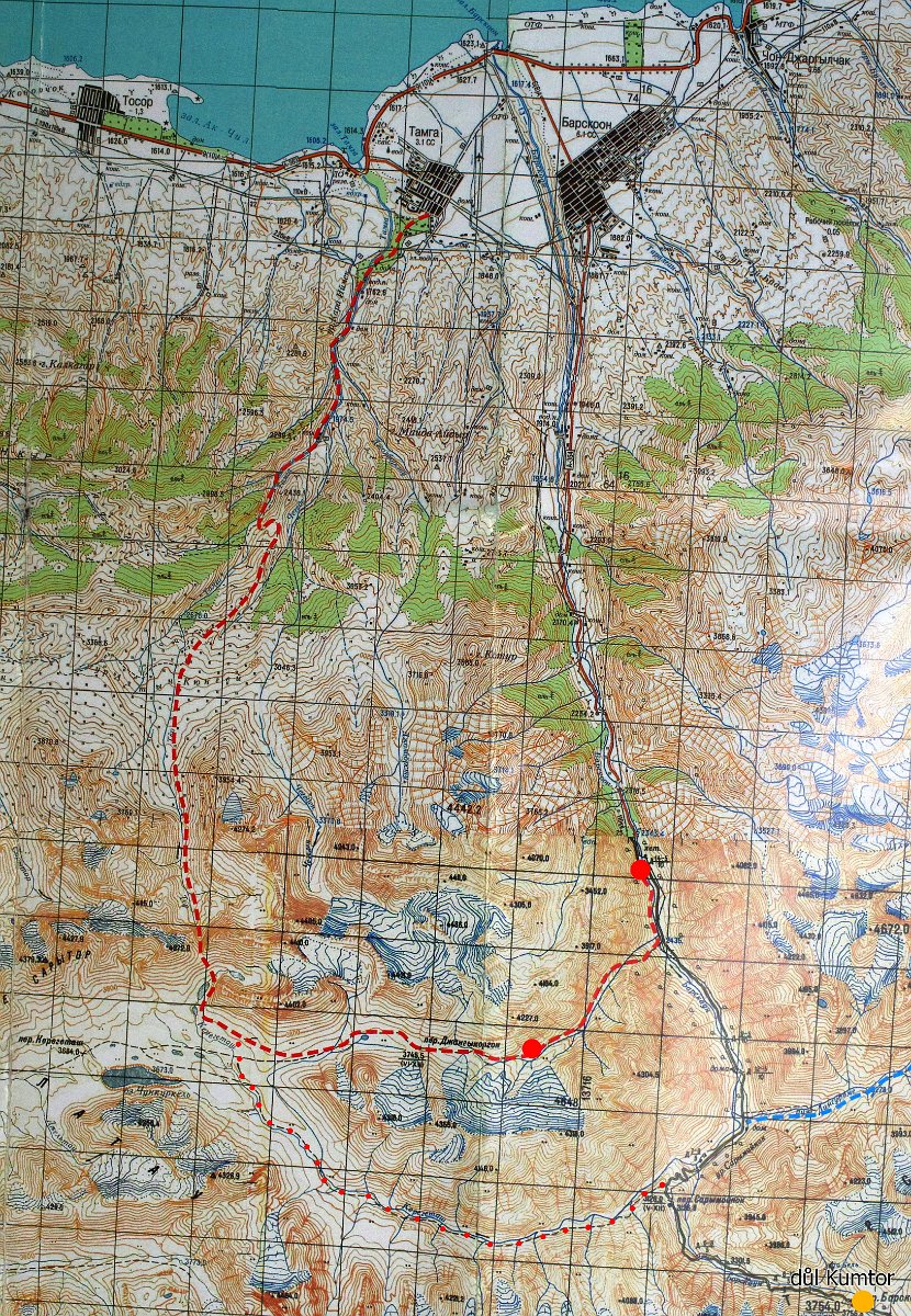 43 Trasa našeho trojdenního výletu byla dlouhá 30 km, nastoupali a naklesali jsme 2000 výškových metrů. Červeně jsou značeny důležité místa, žlutě místo noclehu. Bohužel jsme ze zdravotních důvodů nemohli jít celý okruh (šli jsme tam a zpět), který by končil u jezera Issyk-kul. Přesto se jednalo o zajímavou trasu impozatním ledovcovým údolím v žulových horách, úplně odlišných od hor nad Karakolem.