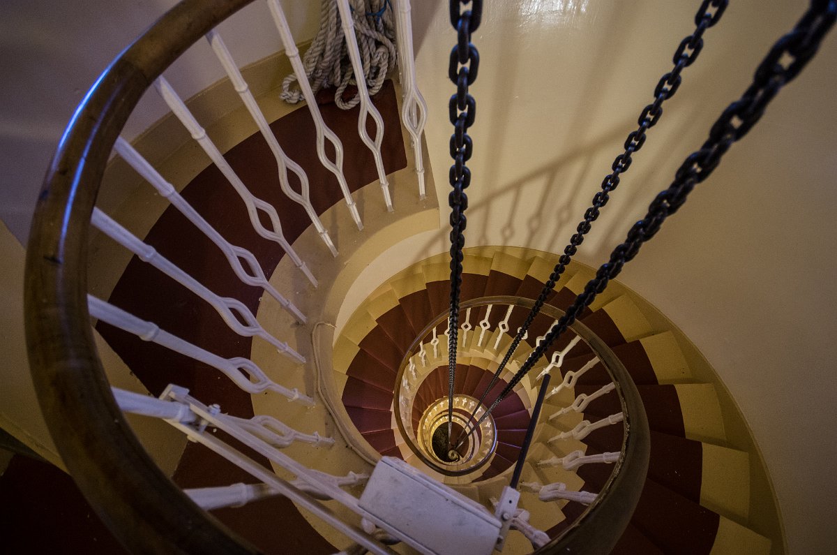 41 Po točitém schodišti vystoupáme na jeho vrchol. Středem majáku je napnuto závaží, které v minulosti pohánělo otočný systém. Budova zahrnovala i pokoj pro strážce majáku a jeho pomocníky. Zaměstnání to bylo nelehké a velice zodpovědné.