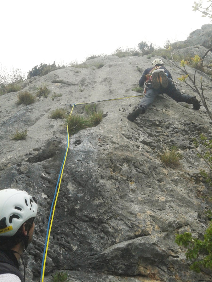 48 Máme za sebou pěknou šestkovou délku. S báglama na zádech dá i tato obtížnost slušně zabrat. Miguel by měl nyní traverzovat doleva, to se mu ale nezdá, a tak pokračuje rovně. Tam ale naráží na sedmičkové lezení a to se mu taky nezdá, tak zase couvá a předává mi štafetový kolík.