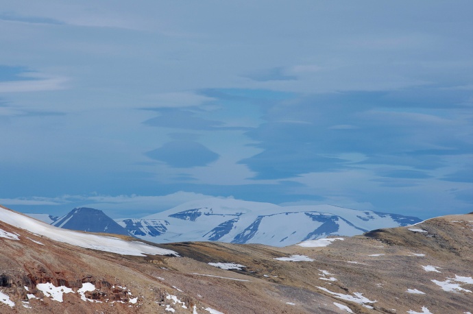 Bouřkové oblaky typu cumulonimbus se takto vysoko na severu nevyskytují (není zde dostatek sluneční energie pro vzestupné konvektivní proudění), tento mrak měl přesto tvar cumulonimbu. Jednalo se však o náhodu a optický klam - spodní část "bouřkového oblaku" tvoří nízký stratocumulus, horní poklička je vytvořena mnohem vzdálenějším a vyšším oblakem altocumulus lenticularis. Dohromady však tvoří pěkné duo :)