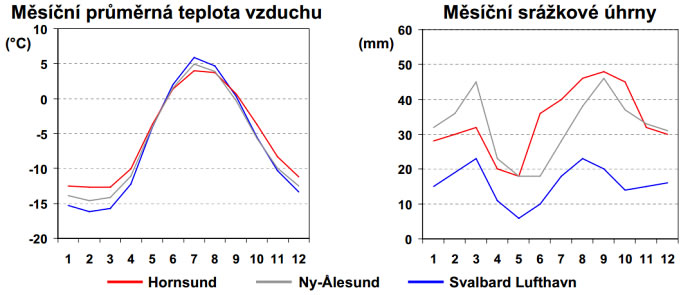 Klimadiagramy ročního chodu teplot a atmosférických srážek na Svalbardu. Mapa stanic zahrnutých v grafech zde.